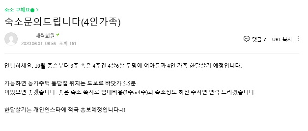 숙소 결정을 위해서는 주변의 경험과 더불어 제주도 숙소 종류를 먼저 검색해 보시는 것이 좋습니다. 일반적인 방법은 네이버 혹은 다음 카페에서 제주도 한달살기, 제주도 숙소 등의 키워드를 검색하여 가입하여 정보를 얻는 방법입니다. 숙소 문의 글을 통해 단기간 수많은 업체로부터 쪽지와 댓글을 통해 내가 원하는 일정에 대략적인 숙박 시세를 확인할 수 있습니다.
