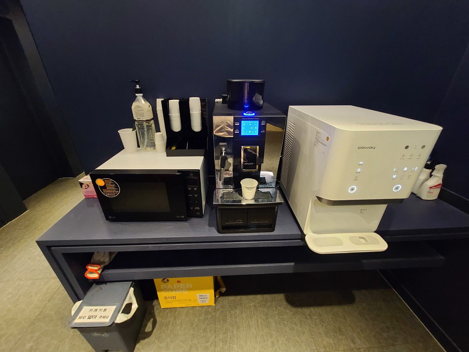 카운터 옆에는 커피 자판기 그리고 전자레인지